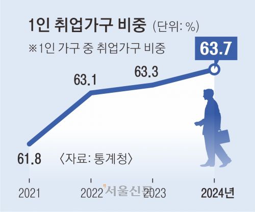 1인 가구가 처음으로 800만 가구를 돌파했다. 1인 가구 중 취업 비율은 63.7%로 역대 최고치를 기록했다. 반면 배우자가 있는 가구 중 맞벌이 가구의 비중은 4년 만에 마이너스로 돌아섰다.
