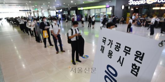 국가직 9급공무원시험의 공개경쟁채용 면접이 시작된 4일 경기도 고양시 일산서구 킨텍스 제2전시장에서 수험생들이 대기장소 입장을 위해 줄지어 서 있다. 2021.8.4 오장환 기자 |