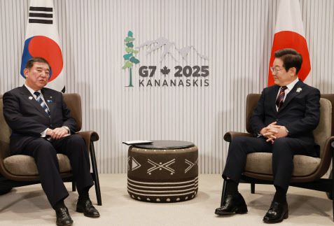 이시바 시게루 일본 총리가 17일(현지시간) 캐나다 앨버타주 캐내내스키스 주요 7개국(G7) 정상회의장에서 이재명 대통령과 한일 정상회담을 하며 발언하고 있다. (사진=연합뉴스) |