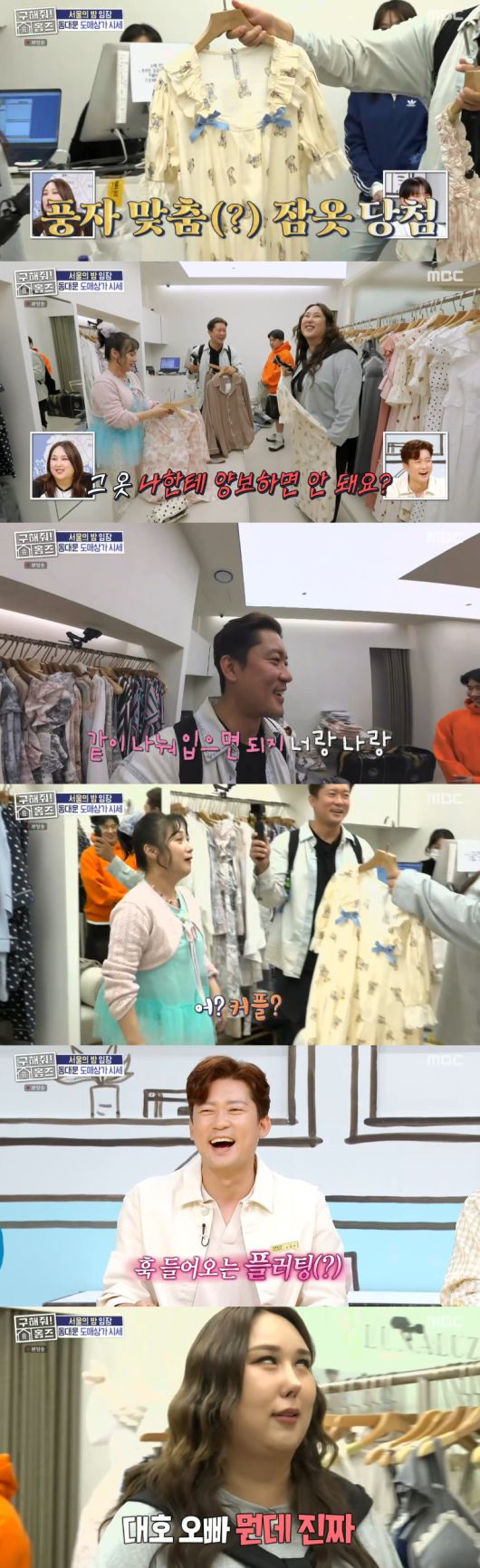 생각보다 괜찮은 수량에 박나래는 '동대문 임장 기념 잠옷 임장'을 제안했고, 그렇게 김대호가 박나래와 풍자의 잠옷을, 두 사람이 김대호의 잠옷을 고르는 방식으로 쇼핑이 시작됐다.