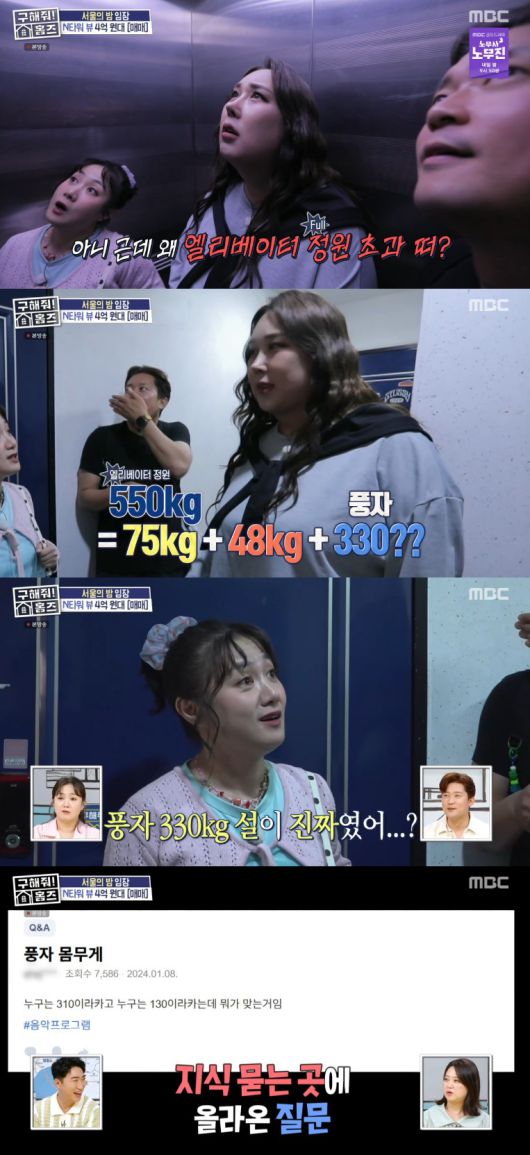 한편, 이날 방송에서는 풍자의 330kg 의혹이 제기되기도. 엘리베이터로 임장지에 올라가던 풍자는 'FULL'이라는 정원 초과 표시에 당황해했다.