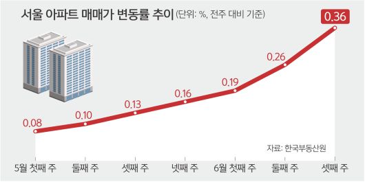 한국부동산원이 19일 발표한 ‘6월 셋째 주(16일 기준) 주간 아파트 가격 동향’에 따르면 이번주 서울 아파트 매매가격은 전주 대비 0.36% 오르며 20주 연속 상승세를 이어갔다. 문재인정부 때인 2018년 9월 둘째 주(0.45%) 이후 최대 상승폭이다.