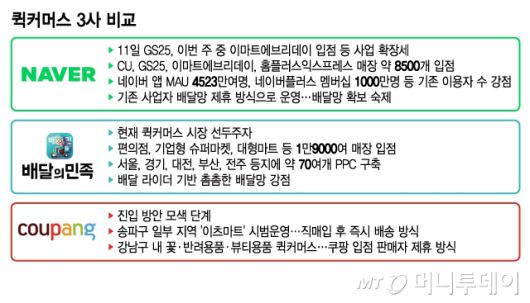 다만 배달능력에 의문부호가 찍힌다. 네이버는 자체투자 대신 CU, GS25 등의 이륜차 배달망을 활용해 상품을 배달한다. 업계에서는 이미 편의점들이 배달능력에서 배민에 밀려 퀵커머스 시장에서 고전하는 점을 고려할 때 자체투자 없이 단순협업만으로는 점유율 확대가 쉽지 않을 것이라고 본다.