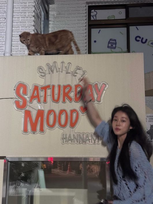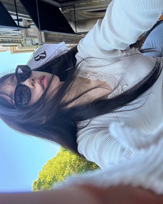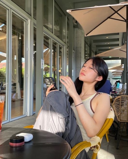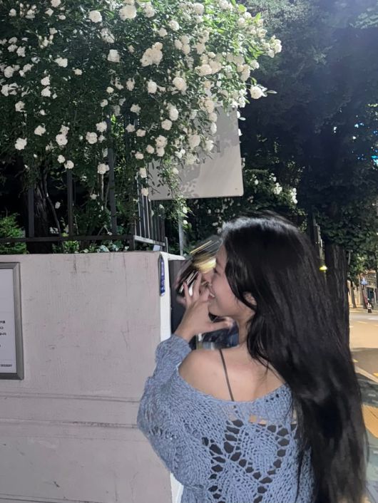 담벼락을 배경으로 찍은 사진 속에서는 검은색 탱크탑과 중청의 데님을 착용한 모습이다. 심플하고 단정해 보이는 룩 스타일에 브라운 벨트와 옅은 그레이 시스루 가디건을 매치해 옷의 스타일리시함을 살리며, 특유의 자연스러운 매력을 한층 돋보이게 한다.