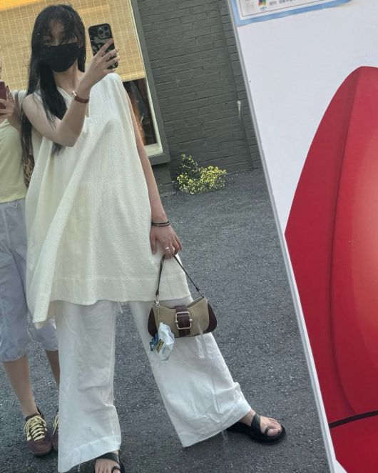 네 번째 사진에서는 여유 있는 옷차림과 함께 셀카를 찍는 모습이 담겼다. 아이보리 린넨 소재의 원피스와 화이트 팬츠를 조화롭게 매치하여 시원하고 깔끔한 스타일을 완성했다. 브라운 색상의 미니백은 전체적인 룩에 트렌디함을 더한다.