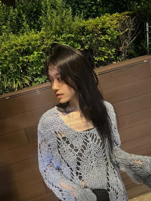 첫 번째 사진 속에서 노윤서는 여러 차례 여름철에 적합한 편안하면서도 트렌디한 룩을 선보였다. 첫 번째 사진에서는 밝은 색의 니트 스웨터와 함께 자연스럽게 풀린 머리를 더해 부드럽고 자유로운 느낌을 자아냈다. 여유 있는 실루엣의 스웨터는 그녀의 내추럴한 매력을 강조하며, 청순한 분위기를 자아냈다.