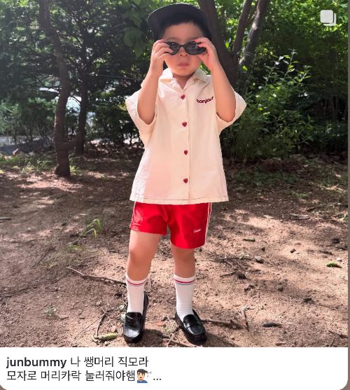 사진 속 준범이는 빨간 반바지에 하얀 셔츠, 그리고 깔끔한 블랙 로퍼까지 더해져 트렌디한 키즈룩을 완성했다. 여기에 “쌩머리 직모라 모자로 눌러줘야 해요”라는 설명까지 붙여 귀여움 지수를 끌어올렸다.