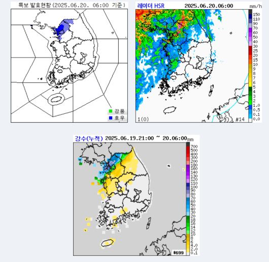 20일 오전 6시를 기해 기상청이 수도권과 강원 일부 지역에 호우 특보를 발령했다.