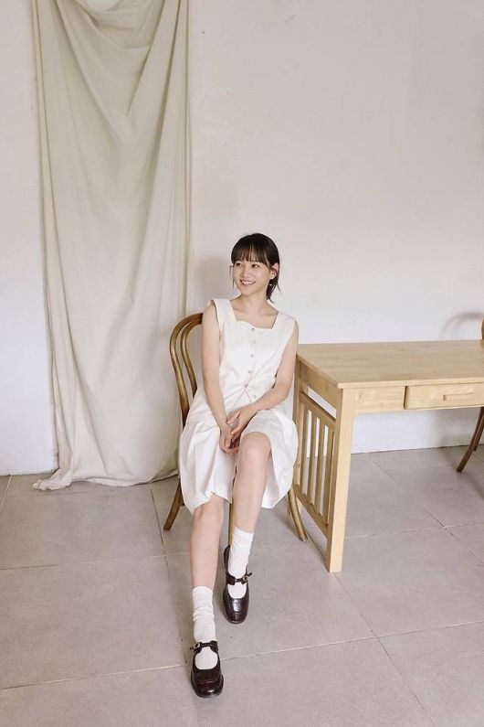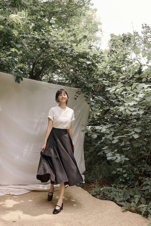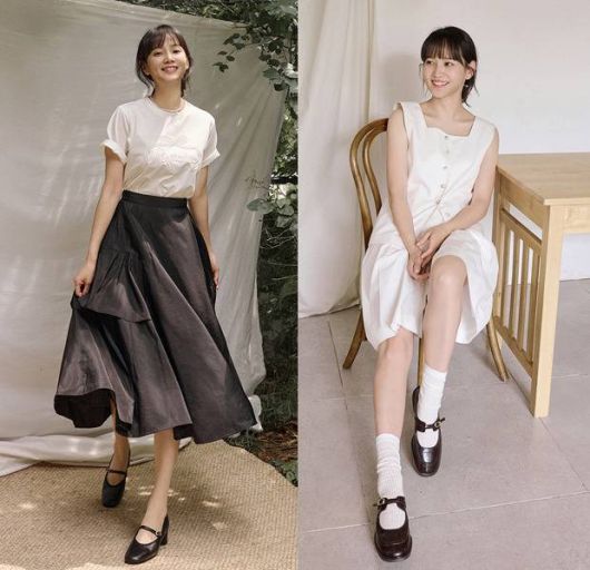 윤승아는 슬리브리스 원피스에 클래식한 메리제인 슈즈, 양말을 더해 레트로한 감성을 가미했고, 다른 컷에선 반팔 티셔츠에 플레어 스커트를 매치해 우아하면서도 따라 하기 쉬운 바캉스룩을 선보였다. 컬러는 차분하게, 라인은 부드럽게 잡아낸 센스가 돋보였다.