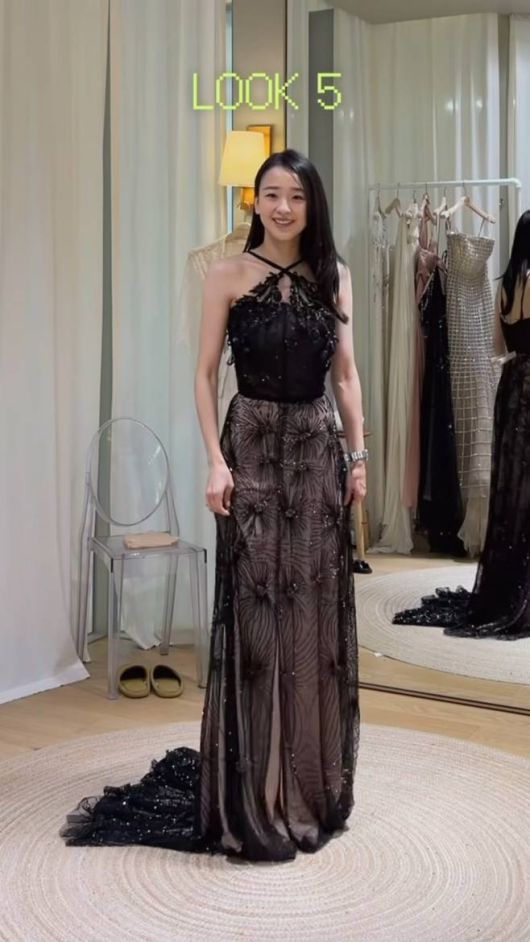 첫 번째 룩은 부드러운 파스텔톤 오프숄더 드레스였다. 드레이핑 디테일과 은은한 광택이 어우러져 사랑스럽고 청초한 매력을 극대화했다. 이어지는 룩에서는 화려한 실버 비즈 장식 드레스로 고급스러움을, 시스루 블랙 드레스에서는 백리스 디테일로 과감한 반전미를 선보였다.