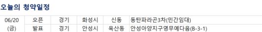 부동산 정보업체 부동산R114에 따르면 20일인 오늘은 경기 안성시 ‘안성아양지구 영무예다음(B-3-1)'이 당첨자를 발표한다.또 경기 화성시 '동탄파라곤3차(민간임대)'가 견본주택을 오픈한다. [이투데이/천상우 기자 (1000tkddn@etoday.co.kr)] ▶프리미엄 경제신문 이투데이 ▶비즈엔터이투데이(www.etoday.co.kr), 무단전재 및 수집, 재배포금지