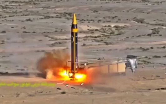 2023년 5월 25(현지시간) 이란이 공개한 호람샤르-4, 즉 케이바르 미사일 발사 장면. 이란은 2000년대 초 북한에서 수입한 화성-10형(무수단 미사일, 나토명 BM-25)을 바탕으로 호람샤르-1을 개발했으며, 이후 호람샤르-2,3 등 개량형을 만든 뒤 독자적 파생형 호람샤르-4를 선보이기에 이르렀다. 호람샤르-4는 최대 80개의 자탄을 탑재한 1500㎏급 모탄을 싣고 2000㎞를 비행할 수 있다. 이란의 파즈르 유도 시스템이 적용돼 정밀 유도 및 재진입체 생존성이 강화된 것이 특징이다. 2025.6.19 파르스 통신 자료 |