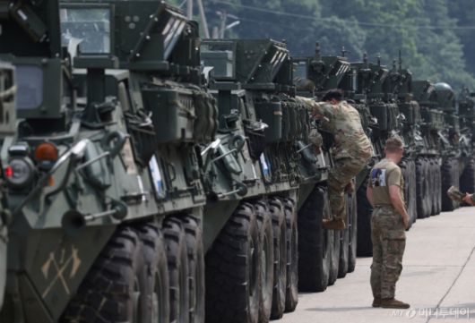 지난 13일 오전 경기 동두천시 캠프케이시에서 새로운 부대와 교대해 본국으로 귀환하는 주한미군 제2보병사단 제1스트라이커여단 장병들이 스트라이커 장갑차를 수송 전 최종점검하고 있다. /사진=뉴시스 |