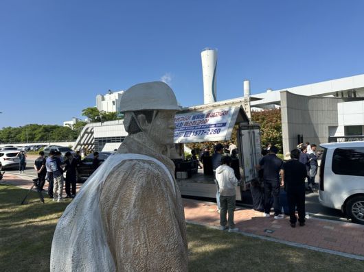 2018년 끼임 사고로 숨진 김용균 노동자상이 사고 장소인 태안화력발전소 정문 앞에 서 있다. 지난 16일 경찰·고용노동부는 지난 2일 이곳에서 끼임 사고로 숨진 김충현 노동자 사고 원인 등을 밝히는 압수수색을 했다. 송인걸 기자 |