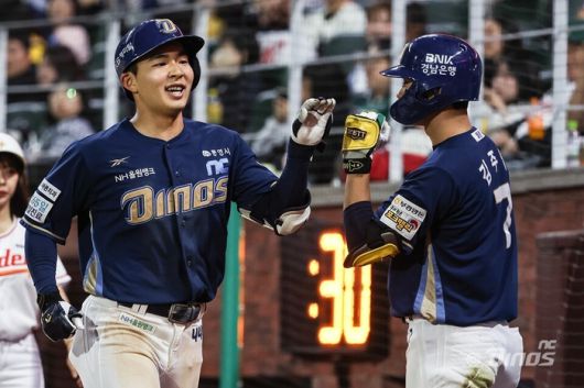 김휘집(왼쪽)과 김주원이 하이파이브를 하고 있다. 사진 | NC 다이노스 |