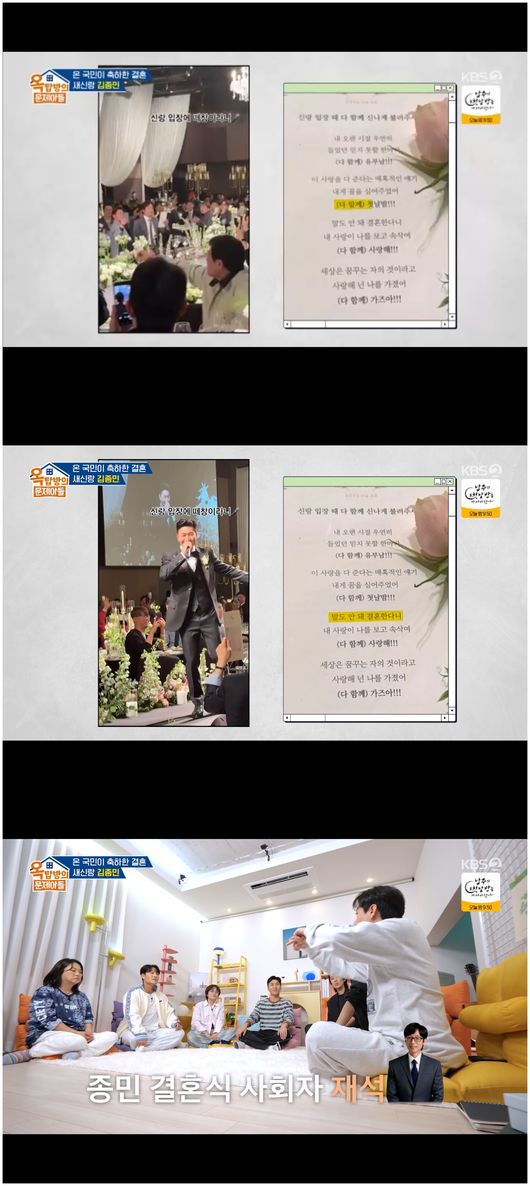 당시 신랑 등장 때 노래를 직접 부르며 등장했던 김종민은 엄청난 화제를 얻었다. 김종민은 “‘우리의 꿈’이라고 해서, 애니메이션 주제가이다. 나만 할 수 있을 거 같아서, 하하가 아이디어를 줘서 하객들이 떼창을 하게 했다”라고 말했다.