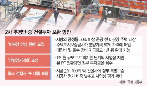 국토교통부는 19일 ‘2차 추가경정예산안’에 이 같은 내용의 건설경기 활성화 방안을 담았다고 밝혔다. 지역 건설경기 회복 등에 투입하는 금액은 총 2조 7000억 원에 달한다. 정부는 이번 추경에서 지방의 공정률 50% 이상 준공 전 주택을 공공이 사들인 뒤 사업 주체에 되파는 ‘미분양 안심환매’를 도입할 예정이다. 이는 지방의 미분양 주택이 6만 가구를 넘어서는 등 시장 침체 여파가 뚜렷해지자 준공 전 단계부터 지원해 건설사의 자금 경색을 막겠다는 차원이다. 총 투입 금액은 주택기금 3000억 원이다. 건설사는 주택도시보증공사(HUG)에 분양가의 50% 수준에서 공사 중인 주택을 매도하면 비용을 정산받을 수 있게 된다. 이 같은 자금을 바탕으로 주택 분양 등에 노력하거나 긴급한 운영비 등에 사용할 수 있게 된다. 1년 뒤 HUG에 환매가격과 매입 경비 등을 합산한 금액을 내면 해당 주택은 다시 매입할 수 있다.