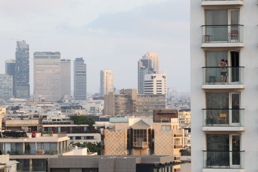 17일(현지시간) 이스라엘 텔아비브에서 이란의 탄도 미사일 공격 위협이 계속되는 가운데 한 남성이 텔아비브 스카이라인이 내려다보이는 호텔 난간에 서 있다. [EPA] |