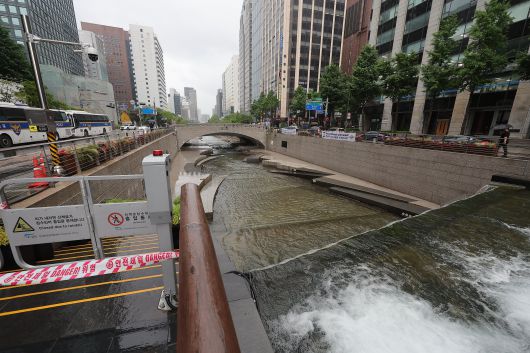 서울 전역에 호우주의보가 내려진 20일 서울 청계천 산책로 출입이 통제되고 있다./연합뉴스 |