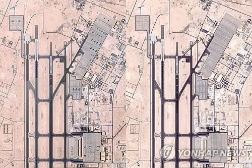 지난 5일(왼쪽)과 19일(오른쪽) 카타르 알우데이드 미군 공군기지의 위성사진. 왼쪽엔 활주로에 항공기가 다수 주기돼 있지만 오른쪽 활주로는 텅 비어 있다. [AFP PHOTO / PLANET LABS PBC. 연합뉴스 자료사진] |