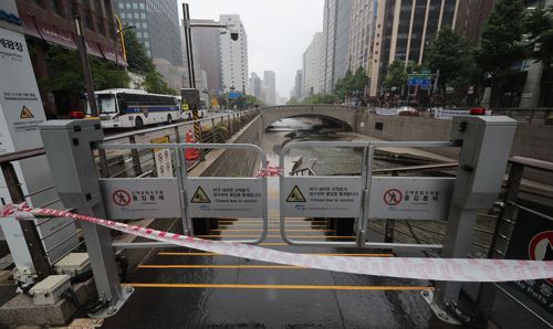 '서울 호우주의보' 청계천 출입 통제 (서울=연합뉴스) 류영석 기자 = 서울 전역에 호우주의보가 내려진 20일 서울 청계천 산책로 출입이 통제되고 있다. 2025.6.20 |
