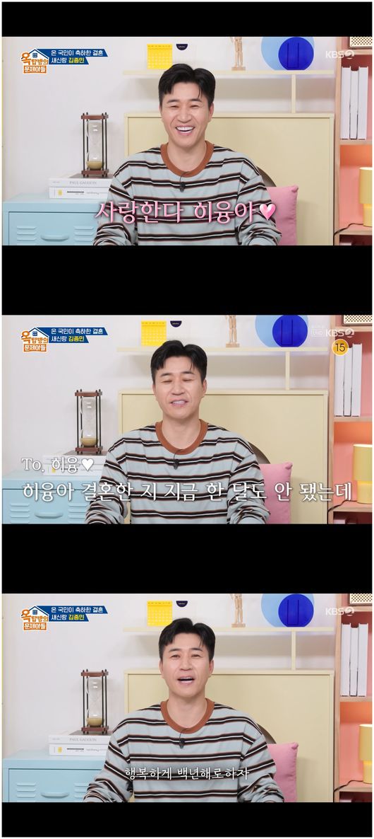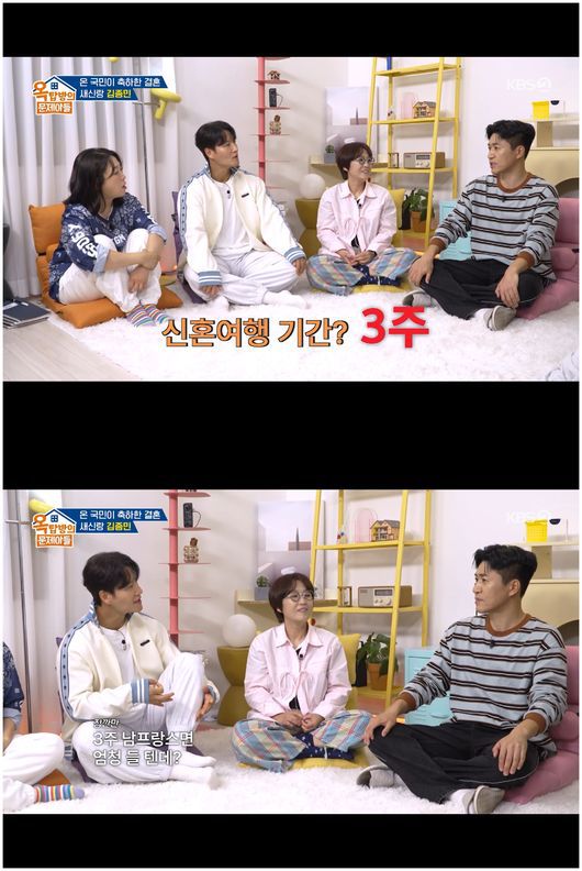 19일 방송된 KBS2TV 예능 ‘옥탑방의 문제아들’에서는 지난 4월 신랑이 된 코요태 김종민이 등장했다. 11살 연하 미모의 일반인 여성과 결혼한 걸로 알려진 김종민은 나날이 얼굴에 윤이 돌았다.