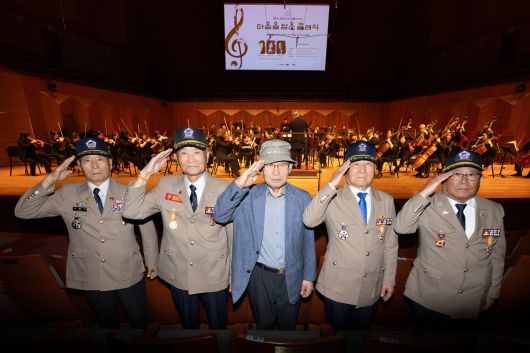 KT가 후원한 ‘마음을 담은 클래식’ 공연에 참석한 국가유공자들이 기념촬영을 하고 있다. |