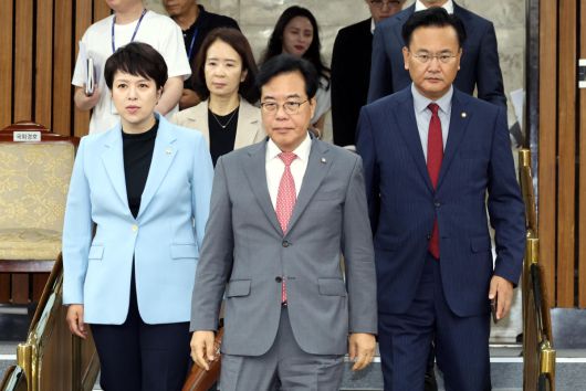 송언석 국민의힘 원내대표가 20일 오전 서울 여의도 국회에서 열린 원내대책회의에 참석하고 있다. 왼쪽부터 김은혜 원내정책수석부대표, 송 원내대표, 유상범 원내운영수석부대표. 2025.06.20. |