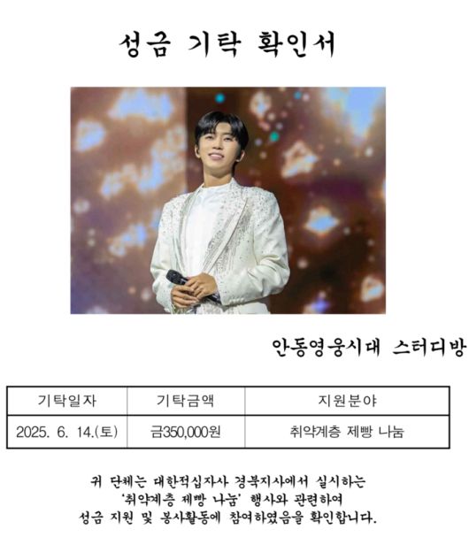 이들의 나눔은 이번이 처음이 아니다. ‘영웅시대 안동스터디방’은 2022년부터 제빵 봉사, 연탄 나눔 등 지역사회를 위한 다양한 선행을 꾸준히 이어오고 있으며, 지난해에는 경북지역 적십자회비 모금에 200만원을 기부하는 등 인도주의 활동에도 적극 참여해 왔다.