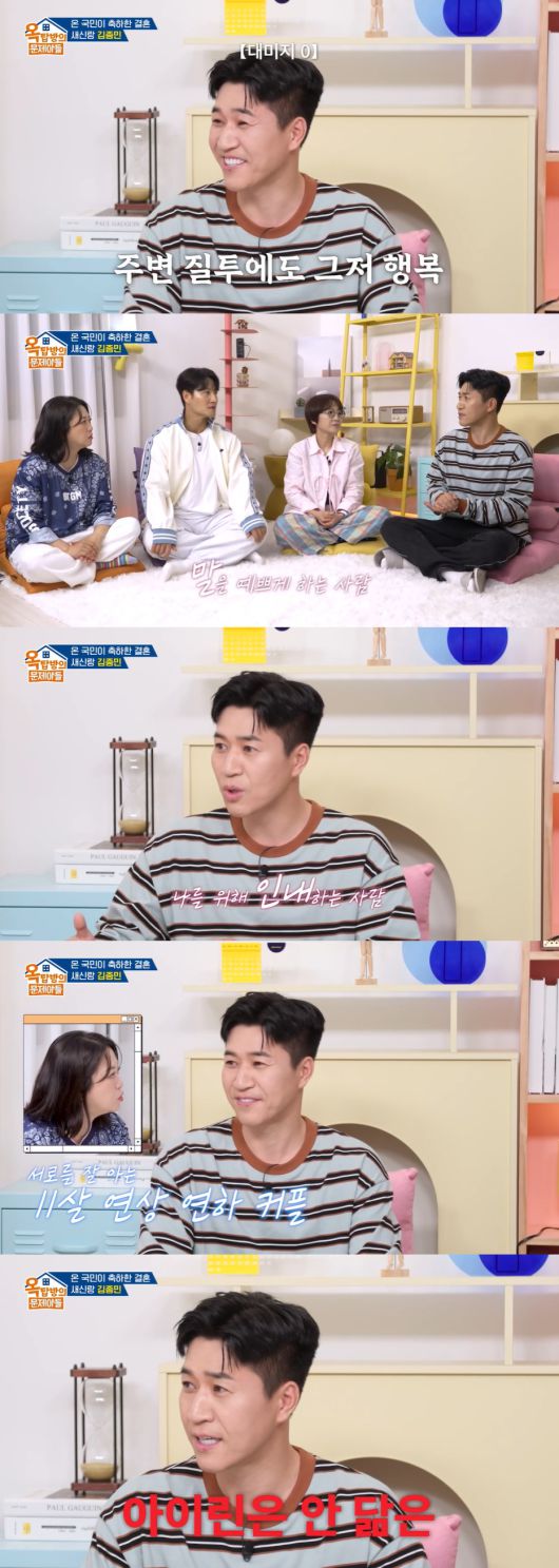 송은이는 "진짜 궁금하다. 비공개 결혼식이어서 아내분이 어떤 분이었을까. 네가 보기에 아내는 '이런 사람입니다'"라며 묻자, 김종민은 "괜찮은 사람이다. 말하는 것도 예쁘게 말해주시고, 저를 너무 많이 이해해 준다. 그래서 신기하다"라고 전했다.