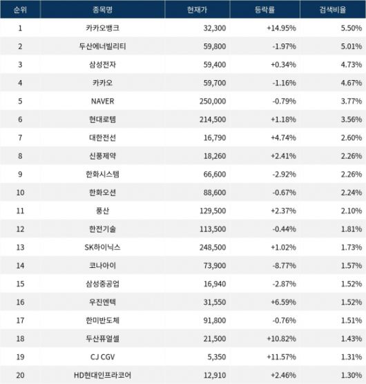 이어 두산에너빌리티(034020)가 검색비율 2위를 기록하며 1.97%의 하락세를 보이고 있다. 검색비율 3위의 삼성전자(005930)는 0.34% 상승하며 큰 변동 없이 출발하고 있다. 검색비율 4위 카카오(035720)는 개장 초반부터 1.16%의 하락률을 보이며 주가가 약세를 보이고 있다. 검색비율 5위 NAVER(035420)는 0.79% 하락하며 조정을 받고 있다.
