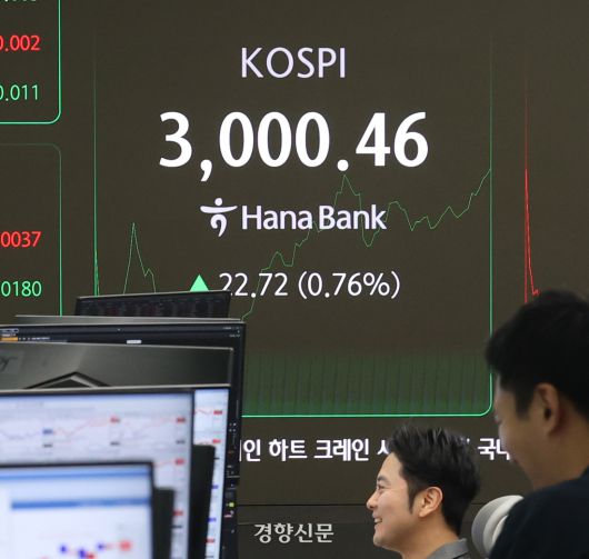 코스피 지수가 장중 3000을 돌파한 20일 서울 중구 하나은행 본점 딜링룸 전광판에 지수가 표시돼 있다. 한수빈 기자 |