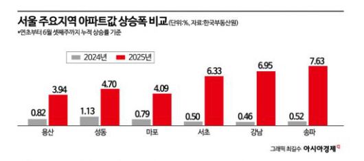 서울 성동구가 한 주 전보다 0.76% 올라 강남 3구를 제치고 주간 상승률 1위에 올랐다. 2013년 4월 다섯째 주 이후 약 12년 2개월 만에 최대 상승률을 기록했다. 강남구(0.75%), 송파구(0.70%), 강동구(0.69%), 마포구(0.66%), 서초구(0.65%) 순으로 상승 폭이 컸다. 강남구와 서초구는 지난 3월 셋째 주 이후 13주 만에 최대 상승률이고, 마포구는 통계 집계 이래 최대 상승률을 나타냈다. 용산구는 0.61% 올라 2018년 2월 이후 7년 4개월 만에 최고치다. 부동산원은 "재건축 추진 단지 및 대단지 등 선호단지 중심으로 매도 희망가격이 상승하고 매수 문의가 많아지고 있다"며 "상승 거래 사례가 포착되는 등 서울 전체적으로 상승세가 이어지고 있다"고 전했다.