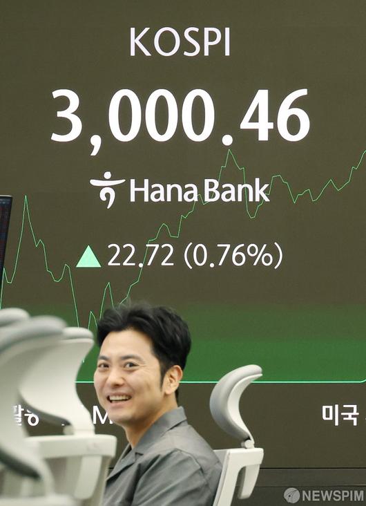 [서울=뉴스핌] 정일구 기자 = 코스피 지수가 장중 3000선을 돌파한 20일 오전 서울 중구 하나은행 딜링룸 전광판에 코스피가 3000.46을 나타내고 있다. 코스피 지수가 장중 3000선에 오른 건 코로나19 팬데믹 기간이었던 2022년 1월 3일(장중 3010.77) 이후 3년 5개월여 만이다. 2025.06.20 mironj19@newspim.com