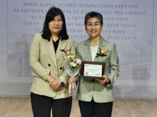 지난 19일 광신중학교, 광신고등학교, 광신방송예술고등학교가 함께한 광신 창학 120주년 기념식에서 학교 발전과 교육환경 개선에 기여한 공로를 인정받아 감사패를 받은 유정희 의원(오른쪽) |
