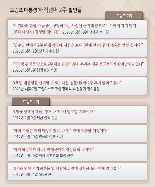 미 워싱턴 정가에서 트럼프의 ‘2주’ 표현은 어느 상황에서든 쉽게 나오는 흔한 말이라는 것이다.