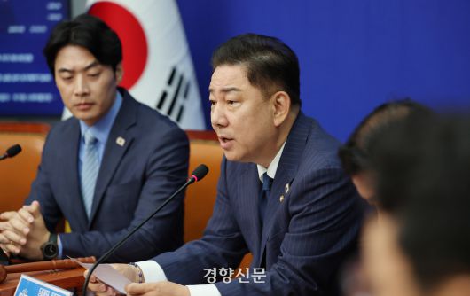 김병기 더불어민주당 대표 직무대행 겸 원내대표(오른쪽)와 한준호 최고위원(왼쪽)이 20일 국회에서 열린 최고위원회의에서 발언하고 있다. 박민규 선임기자 |