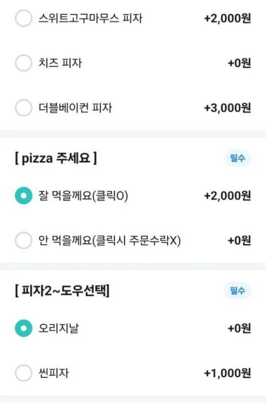 해당 게시물에 따르면, 문제의 피자 가게는 메뉴 선택란에 ‘[Pizza(피자) 주세요]’라는 항목을 추가해 2천 원을 더 내도록 설정해 놓았습니다.