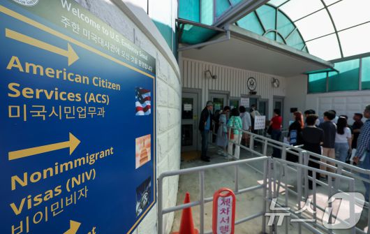 서울 종로구 주한미국대사관 앞에 미국 비자를 발급 받으려는 시민들이 줄 지어 서 있다. 2025.6.5/뉴스1 ⓒ News1 김성진 기자 |