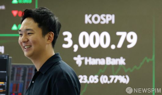 [서울=뉴스핌] 정일구 기자 = 코스피 지수가 장중 3000선을 돌파한 20일 오전 서울 중구 하나은행 딜링룸 전광판에 코스피가 3000.79를 나타내고 있다. 코스피 지수가 장중 3000선에 오른 건 코로나19 팬데믹 기간이었던 2022년 1월 3일(장중 3010.77) 이후 3년 5개월여 만이다. 2025.06.20 mironj19@newspim.com