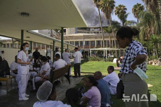 [베르셰바=AP/뉴시스] 19일(현지 시간) 이스라엘 베르셰바에 있는 소로카 병원 단지 내 건물이 이란의 미사일 공격을 받아 연기가 피어오르는 가운데 병원 밖에 의료진이 모여 있다. 이란 혁명수비대는 “병원 근처 이스라엘군 지휘·정보센터가 타격받았다”라고 주장했다. 2025.06.20. |