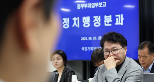 이한주 국정기획위원회 위원장이 20일 서울 종로구 국정기획위원회에서 열린 정치행정분과 검찰청 업무보고에 참석해 대검찰청 관계자들을 바라보고 있다. 연합뉴스 |