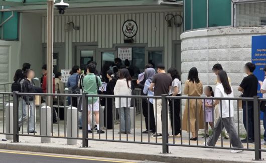 2025년 5월 23일 서울 종로구 주한 미국대사관 앞에서 미국 비자를 발급받으려는 사람들이 줄을 서 있다. (사진=연합뉴스) |