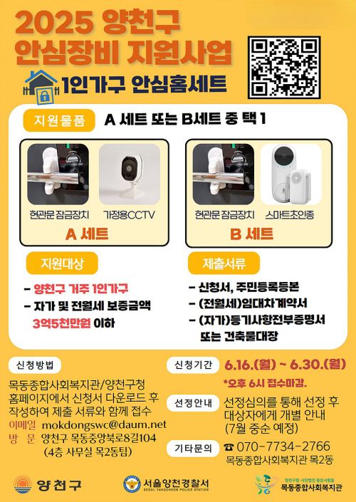 1인가구의 주거 불안 해소를 위해 총 80가구에 ‘안심홈세트’를 지원한다. ‘안심홈세트’는 ▲외부 침입과 문 열림을 방지하는 ‘현관문 안전장치’ ▲현관 상황을 실시간으로 확인할 수 있는 ‘스마트 초인종’ ▲외출 시 집안 상황을 확인할 수 있는 ‘가정용 CCTV’ 등 3종류다. 전월세, 자가 등 주거유형과 관계없이 주택가액 또는 보증금이 3억 5000만원 이하인 양천구 거주 1인가구면 된다.