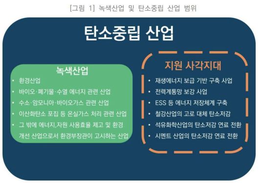 문제는 녹색산업의 범위가 한정적이라 탄소중립 산업이 법적 사각지대에 놓여있다는 것이다. 보고서는 “(녹색산업은) 현재 환경산업, 바이오에너지, 폐기물에너지, 수소, 암모니아, 이산화탄소 포집·운반 산업 등 환경부 전담영역에 국한돼 있다”며 “재생에너지 보급과 인프라 구축, 철강·석유화학·시멘트 산업의 탄소저감은 녹색산업 범주에 빠져 있다”고 지적했다.