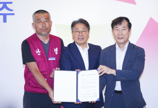 ▲광주 시내버스 노사는 20일 오전 시청 접견실에서 강기정 광주광역시장 중재로 임금 및 단체 협상에 합의했다.(왼쪽부터 박상복 광주지역버스노동조합위원장, 강기정 광주광역시장, 임동춘 광주버스운송사업조합 이사장) ⓒ광주광역시 |