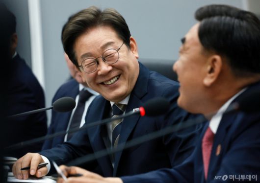 [울산=뉴시스] 고범준 기자 = 이재명 대통령이 20일 울산전시컨벤션센터에서 열린 AI글로벌 협력 기업 간담회에서 김두겸 울산시장의 발언에 웃음을 보이고 있다. 2025.06.20. bjko@newsis.com /사진=고범준