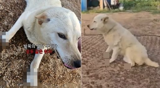 네 발이 모두 잘린 채 구조된 백구. 절단된 부분은 모자이크처리. 자료 : 동물권단체 케어 인스타그램 |