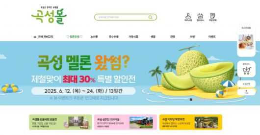 현재 곡성몰에서는 매주 수요일 진행되는 ‘수퍼딜 30%’ 이벤트와 지난 12일부터 오는 24일까지 운영되는 ‘곡성멜론 제철맞이 30% 특별전’이 소비자들에게 큰 호응을 얻고 있다. 또 카카오톡 친구 추가 시 2000원 할인 쿠폰을 제공하고, 리뷰 작성 고객에게는 최대 1000원 할인 쿠폰을 지급하는 등 풍성한 혜택을 제공 중이다.