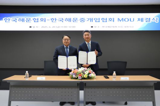 한국해운협회는 한국해운중개업협회와 '해운산업의 지속 가능한 발전과 상생협력 강화'를 위한 업무협약(MOU)을 체결했다고 20일 밝혔다. 양 협회는 해운 시황 정보 및 데이터베이스(DB) 공동 활용, 해운 인재 양성과 실무자 교류를 위한 공동 교육, 해운 디지털 전환 및 플랫폼 구축 등 다양한 분야에서 협력한다.